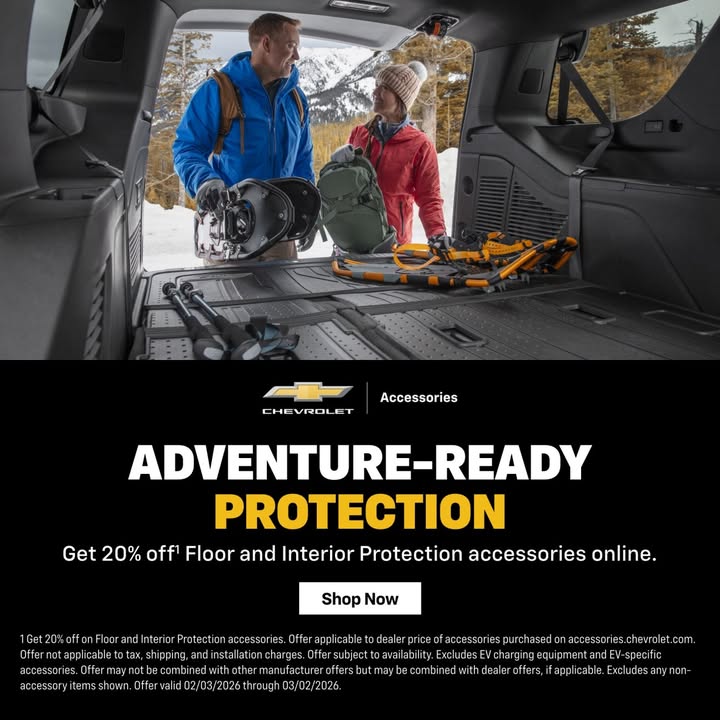 Upgrade your Chevrolet for any adventure with 20% off(1) Floor and Interior Protection accessories online