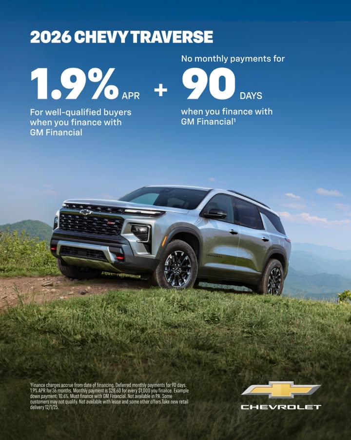 Now, well-qualified buyers can get 1.9% financing on a 2026 Chevy Traverse, plus no monthly payments for 90 days when you financ...