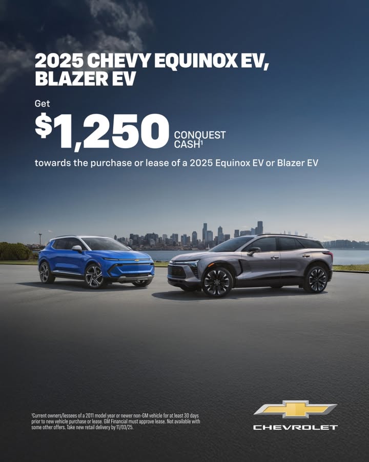 Now, non-GM owners and lessees can get $1,250 conquest cash(1) towards the purchase or lease of a 2025 Chevy Equinox EV or Blaze...